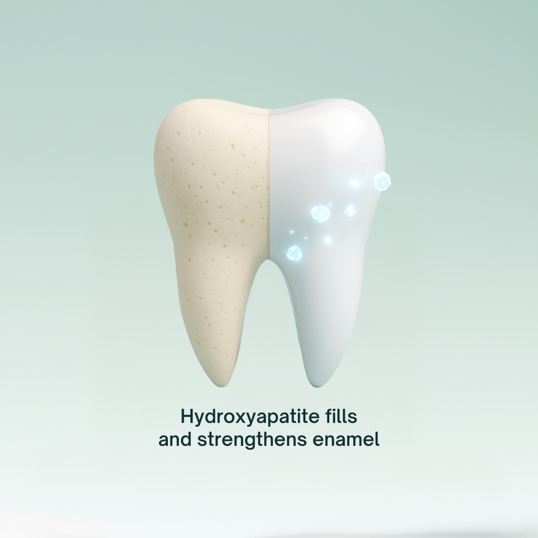 Hydroxyapatite is the same mineral your enamel is made of. When it comes in contact with weakened areas on your teeth, it helps refill and seal those tiny pores — leaving the surface smoother, stronger, and more resistant to stains and sensitivity.